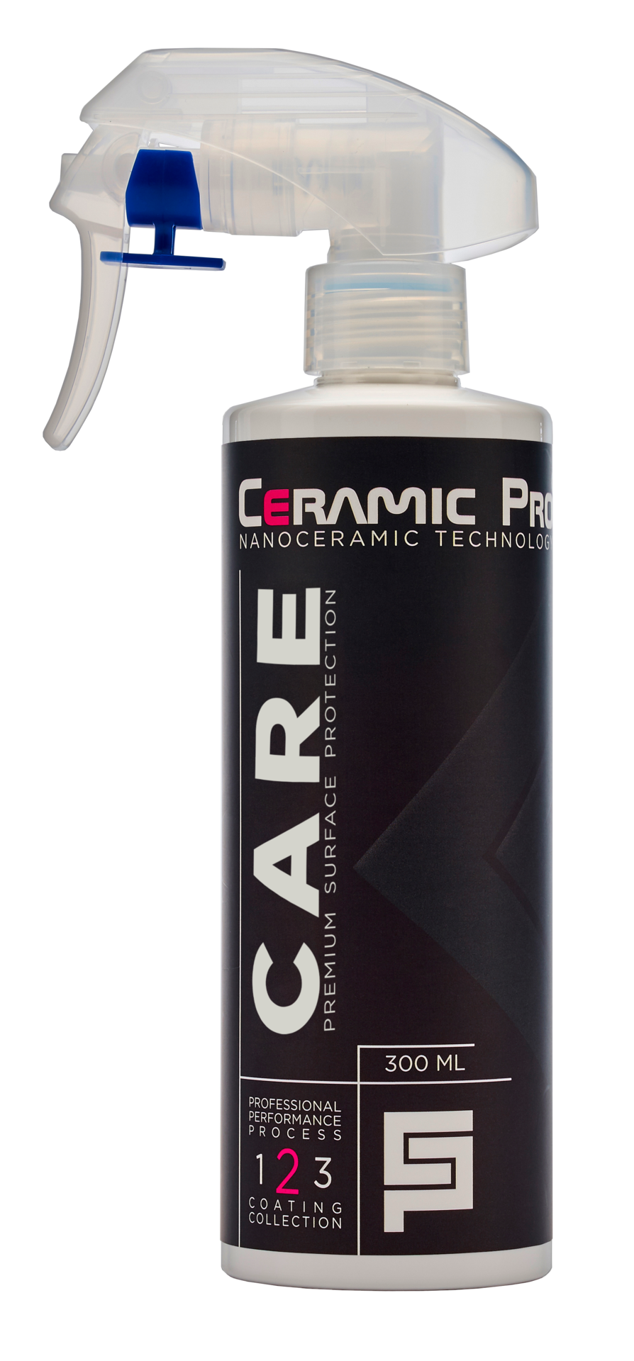 Ceramic Pro Care pode ser usada como revestimento para manutenção de todos os outros produtos Ceramic Pro. A sua fórmula única foi desenvolvida para restaurar o efeito super hidrofóbico dos revestimentos Ceramic Pro. Deve ser aplicado com toalhas de microfibra sobre a superfície molhada após a lavagem e esfregado enquanto a superfície é seca, garantindo assim que o efeito hidrofóbico seja potencializado e reduzindo qualquer possibilidade de manchas causadas pela água. Ceramic Pro Care pode ser aplicado na maioria das superfícies utilizadas em enumeras indústrias